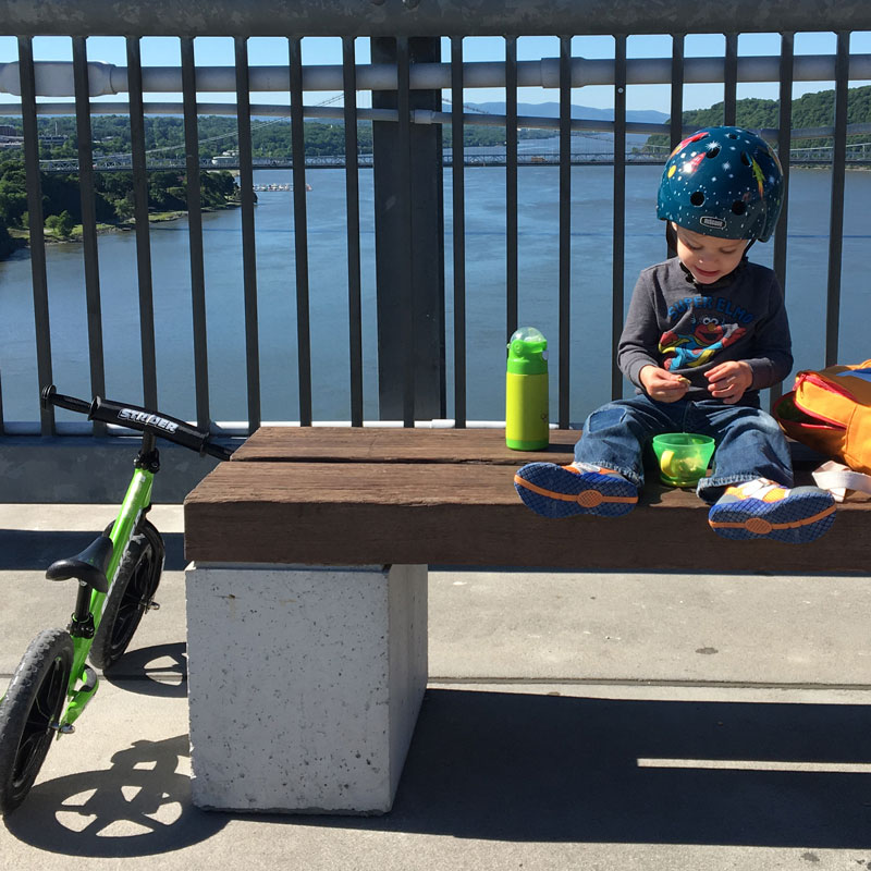 Some kids are cautious and may not even sit on the seat at first. This is OK! Their security is in their feet at this point, and we want them to feel secure. As they become comfortable walking around with the bike between their legs and using the handlebar, they will start to “trust” the seat. Some kids get to this point within minutes, and others may take weeks, but all children will eventually get there. Let them transition at their own pace… they’ll be striding along with their feet up on the footrests before you know it!