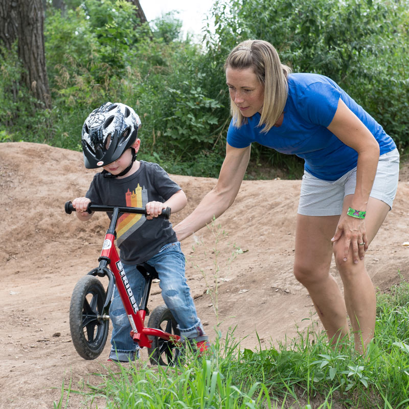 We instinctively want to help the child by holding onto the bike to keep it from tipping; don’t do this. If the adult supports the bike when it tips to one side, the child mistakenly thinks the most stable place for the bike is tipped over to the side. If the child needs assurance, walk next to them and hang onto the back of their shirt so they feel safe.