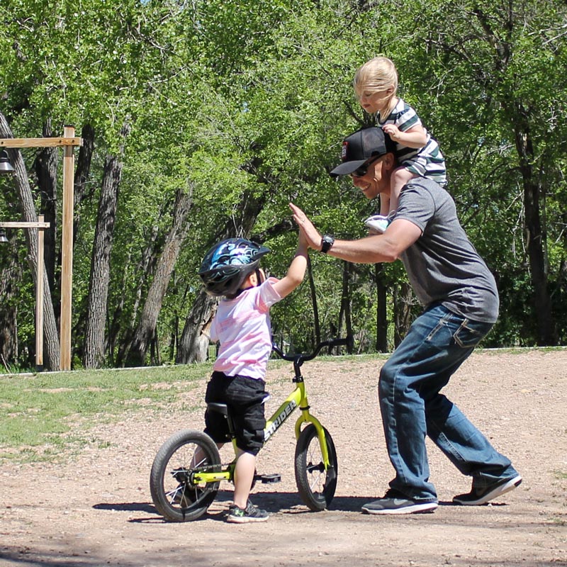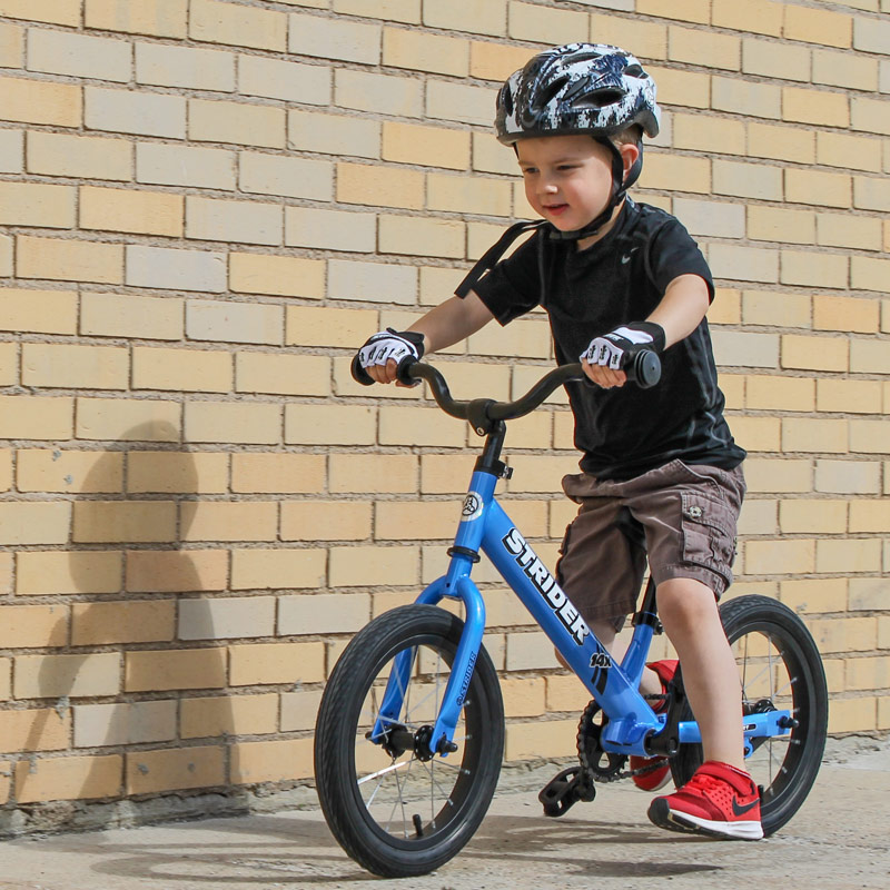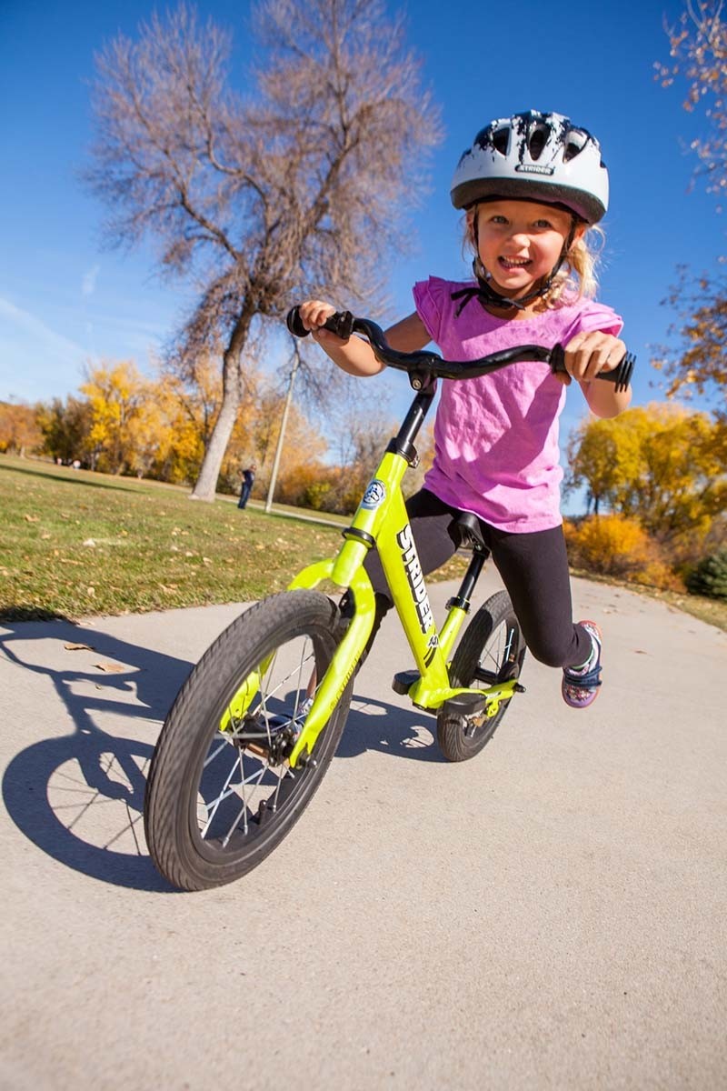 When children have the opportunity to gain momentum while striding on their pedal bike, it develops confidence. We suggest simply having children find the pedals with their feet and use them as footrests when they are riding and practice with the pedal bike the same as they would on a balance bike before even attempting to pedal.